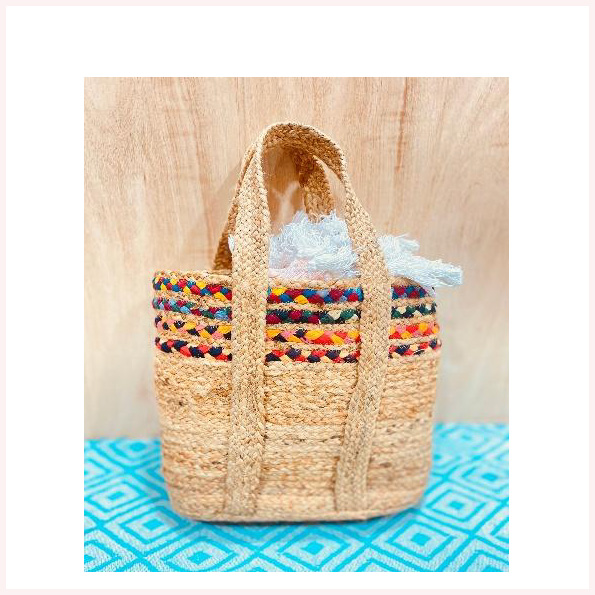 Artisan Woven Natural Jute Tote Bag with Colorful Braided Border – Handcrafted Eco-Friendly Carryall for Women